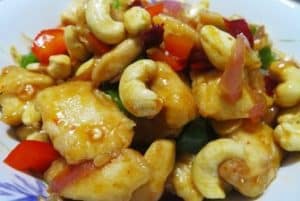 Pouletfleisch in teriyaki sauce gebraten mit cashew-nussen chmapignon und gemüse