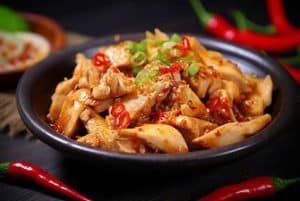 Pouletfleisch in sambal sauce gebraten, mit champignons und gemüse