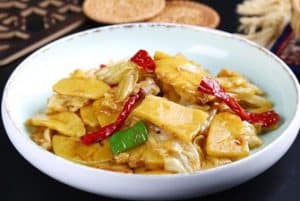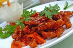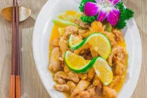 Frittierter pouletfleisch in suss-saurer sauce.mit ananas