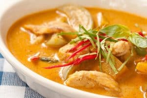 Pouletfleisch in roter currypaste gebraten, mit kokosmilch champignons und gemüse