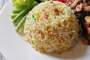 Gebratener reis mit eier, crevetten, surimi, gemüse