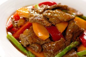 Rindfleisch in schwarzem pfeffer sauce gebraten, mit champignons und gemüse