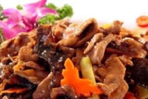 Rindfleisch in teriyaki sauce gebraten mit bambus und champignon